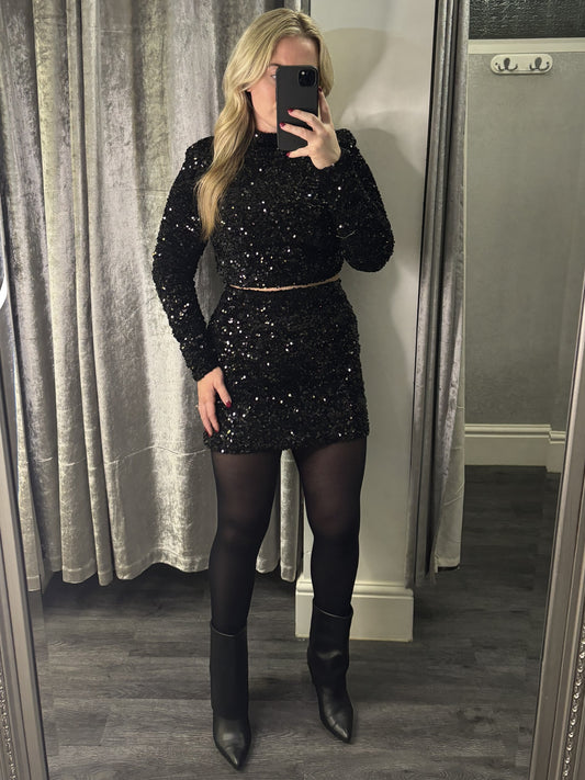 Black Sequined Long Sleeve Cropped Top