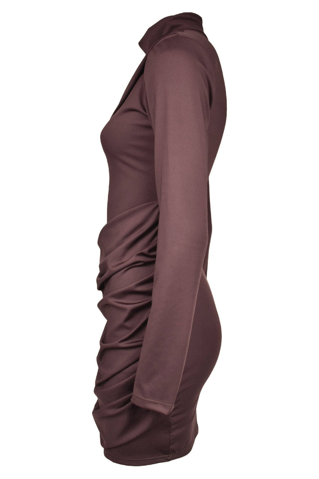 Elevate your party season with this stunning plum dress featuring a flattering ruched front, elegant draped sash, and structured shoulder pads. The high neckline and long sleeves deliver timeless sophistication, whilst the responsive stretch fabric ensures a comfortable, personalised fit that keeps you looking and feeling confident all evening.
