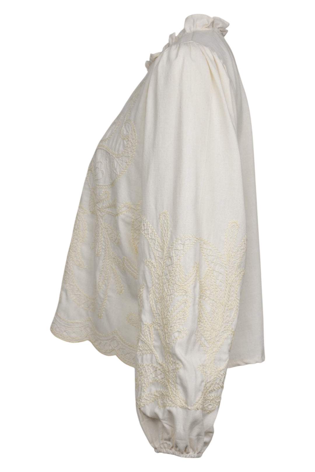 Elevate your wardrobe with this charming cream blouse, featuring delicate embroidery that adds understated elegance. The distinctive frill neckline frames your face beautifully, while voluminous balloon sleeves create a flattering silhouette. A scalloped hem provides a refined finishing touch that sets this piece apart from everyday basics. Perfect for dressing up casual outfits or adding sophistication to your professional look.