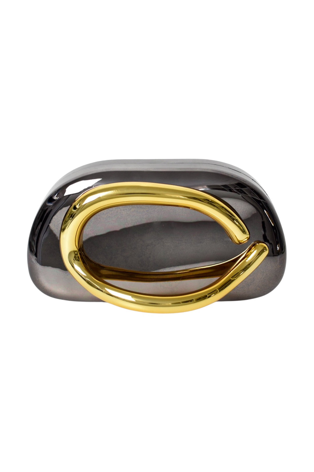 Our Silver & Gold Metallic Box Clutch features a sleek moulded metal grab handle in contrasting gold and a contemporary, modern design. It also includes a detachable chain for versatile styling options, perfect for adding a touch of elegance to any outfit.