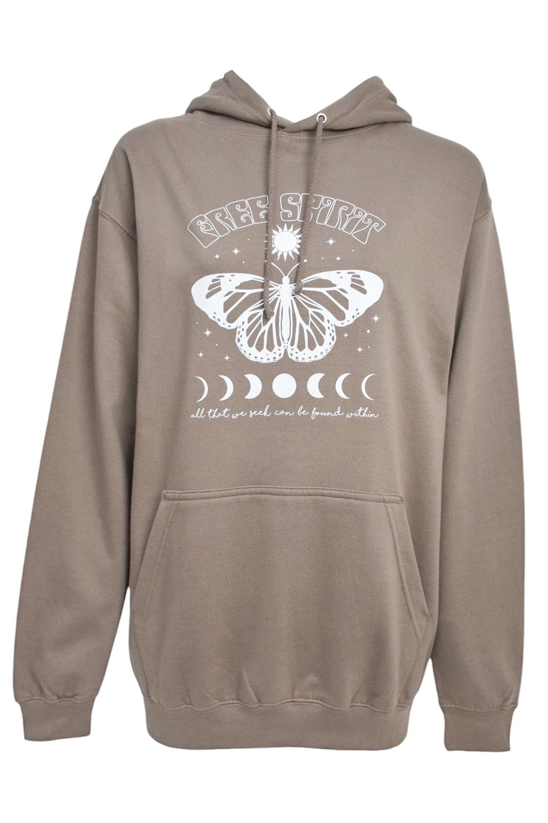 Exclusively designed & printed by us in house, our Mocha Free Spirit Hoodie is one for the spiritual souls with it's positive quote and contrasting design of a butterfly & moons. The oversized fit, cuffed sleeves & drawstring hood will make you feel comfortable and empowered in this must-have hoodie. Perfect for lounging or making a statement showing off your inner free spirit in this lovely neutral tone!